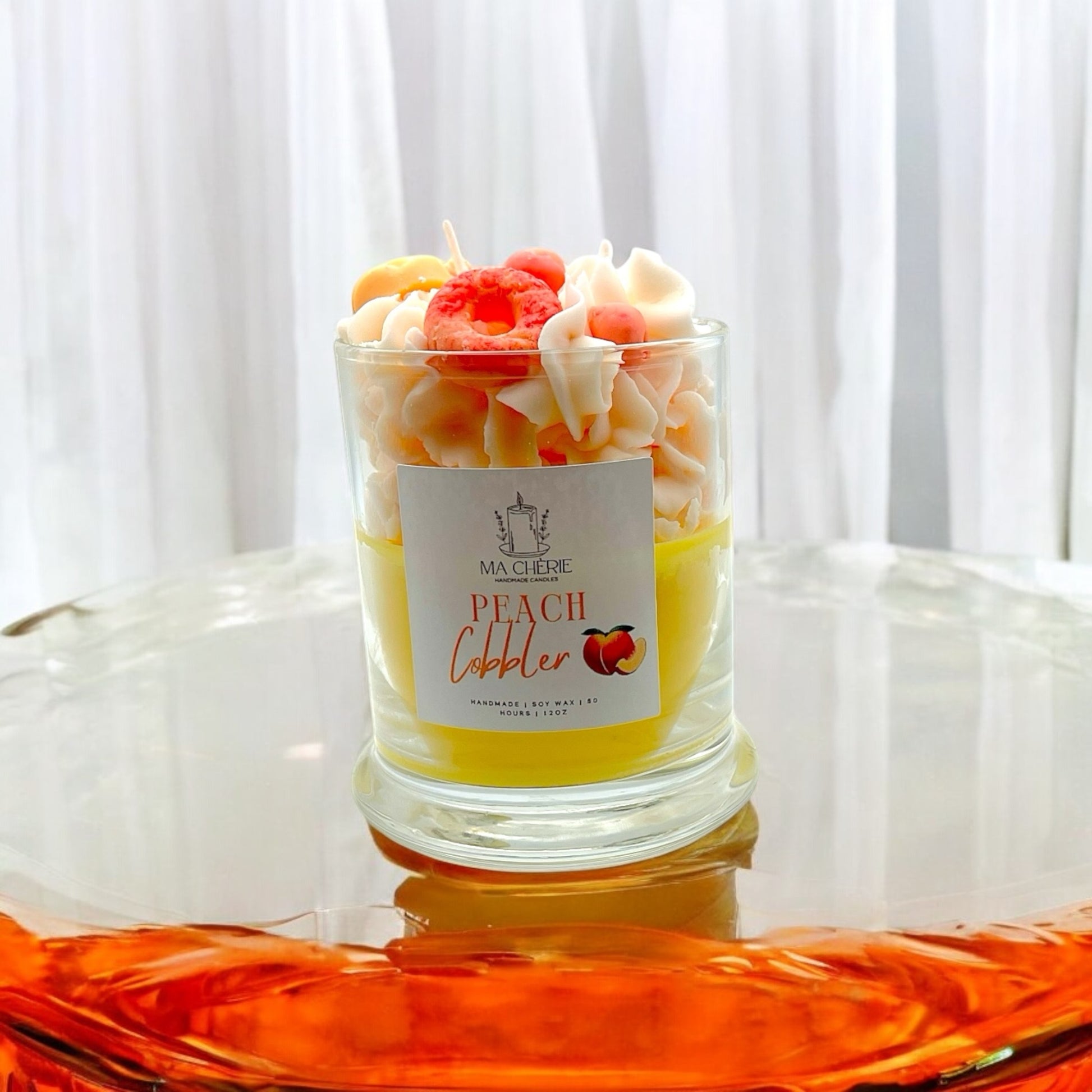 Experience the warm, inviting scent of our Peach Cobbler candle. Made with a hand-poured blend of soy wax, this 12oz candle features a delightful combination of peach and fruit slices fragrances. Enjoy a comforting and relaxing atmosphere with every burn.